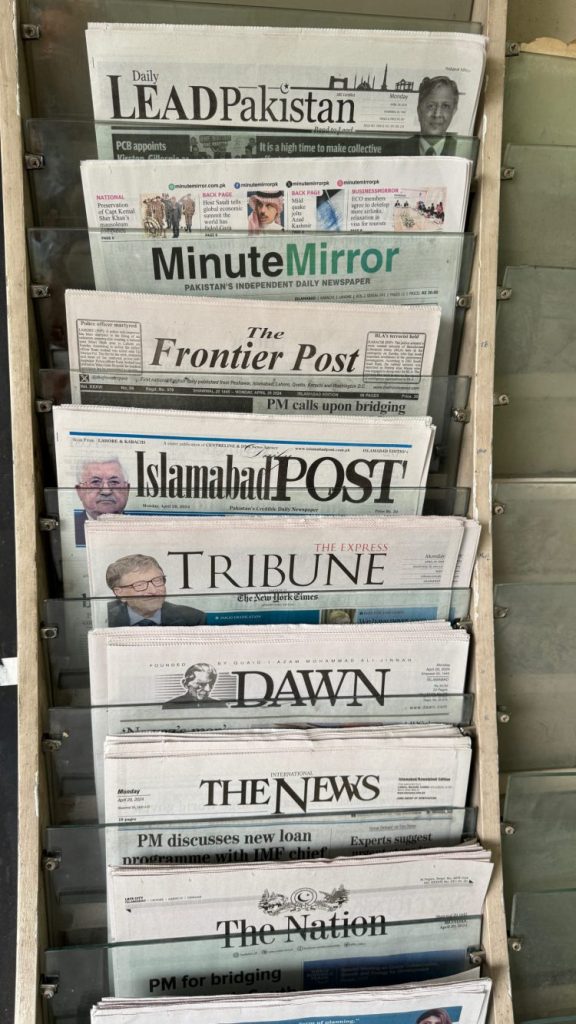 English newspapers on sale at an Islamabad newsstand. English is an official language in Pakistan.