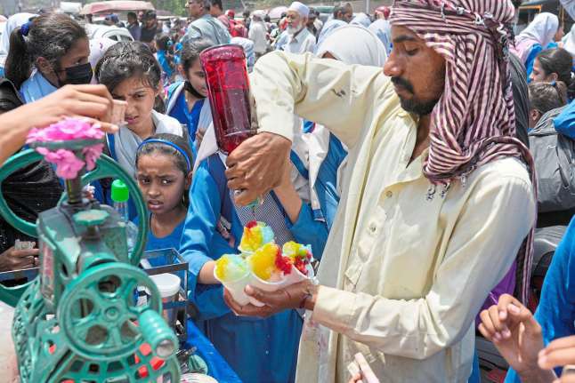 Students buy shaved ice cups from a street vendor in Lahore. – AP