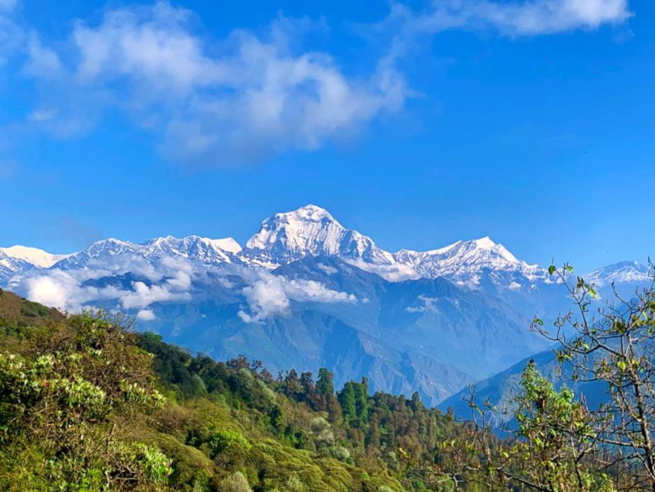 幸好,第二天一大清早起床,群山就在眼前,包括左侧隐隐约约的Annapurna South(7219米),以及右侧的Himchhuli(6441米)。美景当眼,空气怡人,大家心情大好!