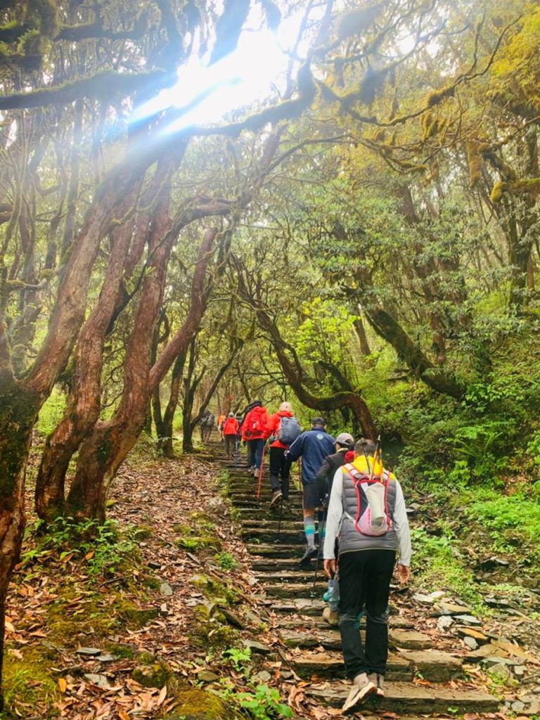 准备就绪后,今早继续挑战再攀走到2874米的Ghorepani。这一天,总共走了5个小时,近9公里路,一路上都是古木参天清凉无比。第三天凌晨4点,我们在冒雨的情况之下,攻顶了!对,就是今次健行最高目的地3210米的布恩山。 :3公里上下山梯级,总耗时近2小时不等。