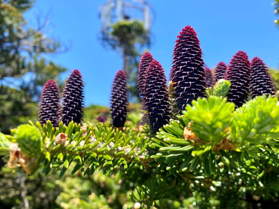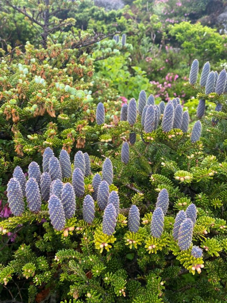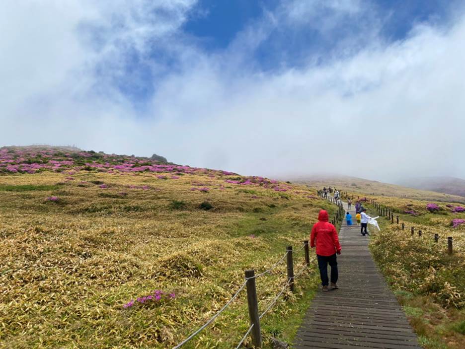 一直往上攀至1650米的山顶平原区域,这里的草木属于芝灌性,也栽种了一大片高原杜鹃花,6月份正是满开季节,风吹时宛如紫海翻波,好迷人啊!继续徒步前进,只见斜坡上有个“1700米”石牌,牌上设有休息间等等,其余基本实施完善。只不过,继续前进到顶端1947米的火山口之时,却因为步道维修之故,暂时关闭。据了解,汉拏山周围有着360座因火山爆发形成的小火山,连同一条世界最长的14公里熔岩隧道“万丈窟”,以及“城山日出峰(在2007年被列为世界自然遗产)”。2010年,济州岛荣获世界地质公园荣誉。