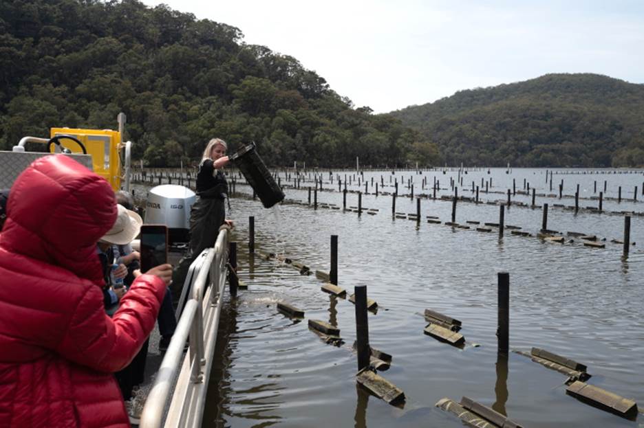 渡轮徐徐开入平静的Hawkesbury海口,眼前所见,全都是生蚝养殖场。卡琳说:悉尼海鲜市场的大部分生蚝也来自这里唷!接着,卡琳开课喽!她滔滔不绝地为我们讲解养殖过程。