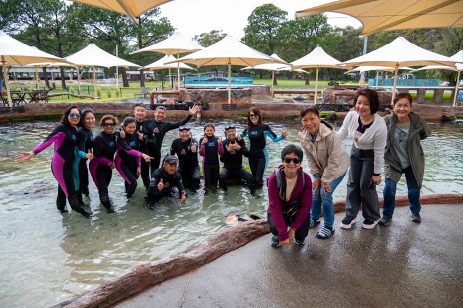 还有啊,史提芬港有个奇特的体验式主题水族馆。我们穿上潜水服带上潜镜,浸泡在十米深的咸水里池里,与数十只魔鬼鱼与鲨鱼一起游泳嬉戏。不想下水的旅友们,就坐在人造沙滩上,一边听取导览们的讲解,一边轻轻抚摸游来游去的魔鬼鱼。我们又上了宝贵的一堂课喽!