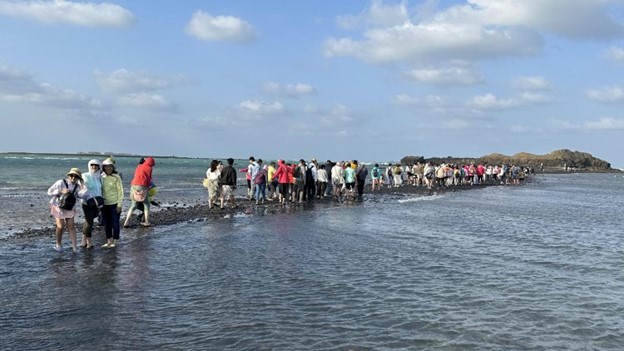 第二天:风柜听涛 – 山水30高地 – 林投公园 -南寮浮球秘境 – 奎壁山摩西分海 – 住宿马公市。这“摩西分海"是个特别的大自然景观,傍晚时分潮水渐渐退去之后,海上会出现条“小路",让人们可以步行着走到对面的一座岛屿上,奇观也!