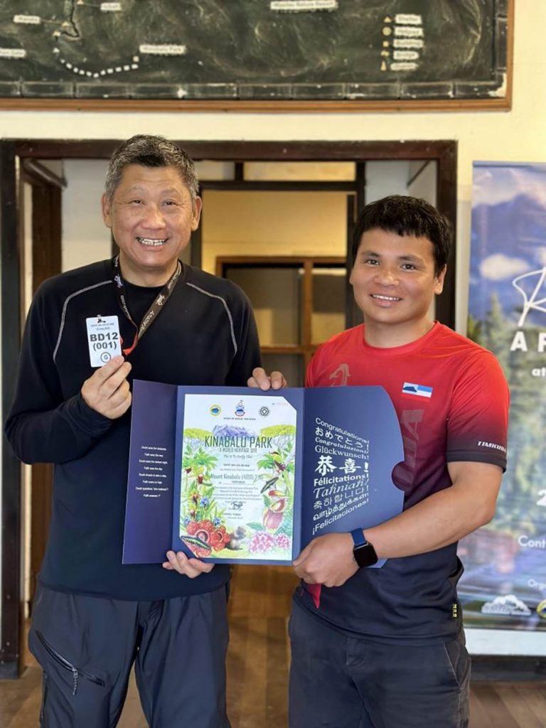 从登山向导Gasbriel手中接过《征服神山证书》。出发前只要锻炼一下下,人人都能征服大马境内最高点!