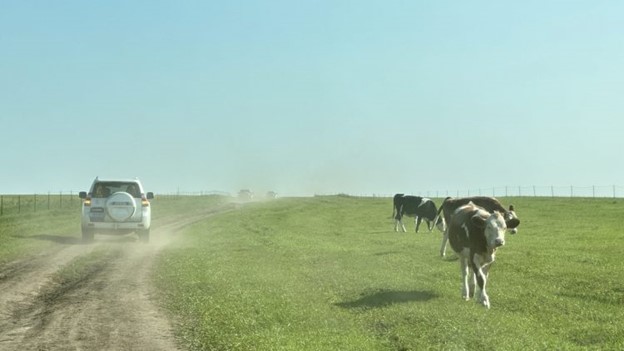 17辆白色簇新的丰田Prado四轮驱动车一字排开,我们以每辆2人共乘上车,越野车井然有序地朝呼伦贝尔大草原前进。路途中,想到大草原的乳牛、绵羊、马儿们,能幸福地生活在中国最大、世界最美的大草原上,每天都是那么地悠哉悠哉……啊,好羡慕!