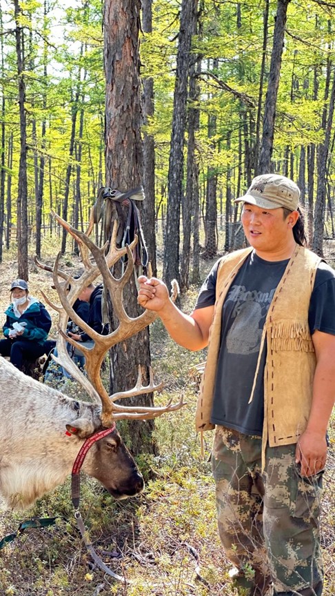 “呼伦贝尔号"早已在林中搭起帐篷,准备了茶点 ,我们悠悠坐在小木椅上,赞叹着空气是如此地清新。这时,鄂温克族人唱起了山歌,一群精灵般的野生驯鹿竟跑了过来,犹如前来伴舞呢!这些是“森林之舟",它们会用温润的舌头舔舐你,再把毛茸茸的头颈趋向你的掌心,向你讨拍。驯鹿不怕生人,这是来自动物的纯粹渴慕与亲近之意,一切是那么的自然又纯净。