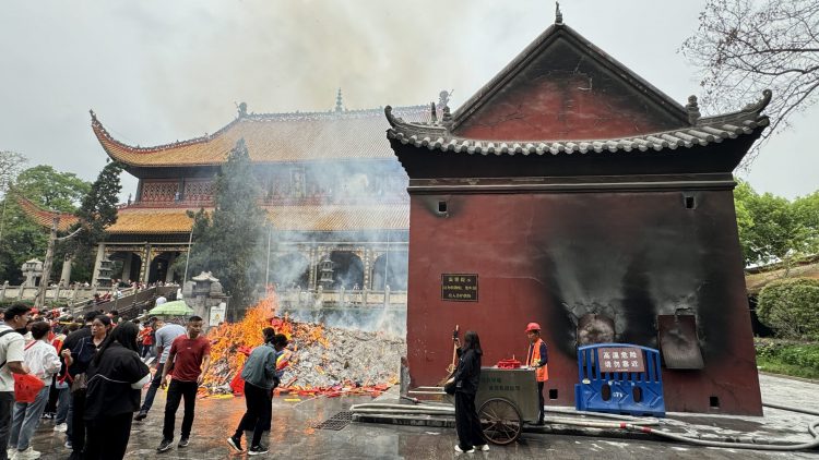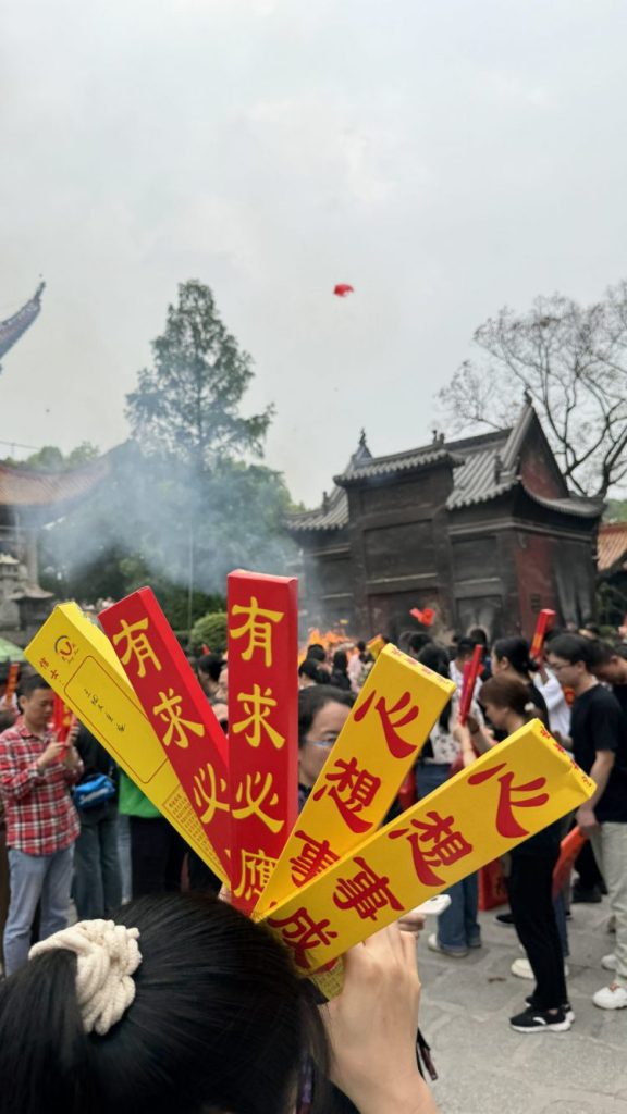 负责文旅观光的戴局兴奋地说:每年有着超过1000万人次的香客到来南岳大庙烧香拜佛,祈福祝愿!我站在圣帝殿火神庙前,看着众信徒们把香纸香烛连同祝愿盒一起抛到露天焚烧丘,完成了整个膜拜流程,也心满意足地离开大庙,期许明年再来还愿。戴局说:李桑你也来许个愿,很灵的。
