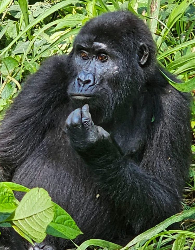 话说回头,在Bwindi国家公园,我们一行11人被分成两支队伍,6人组由四轮驱动车载往海拔2000米的国家公园入口处,登山步行了40分钟后,终于与5只大猩猩家族成员相见欢。至于5人组嘛,则选择比较高难度的行程,这队伍得登山步行往返5个小时,才能见到更加罕有的大猩猩家族成员喔!这队由我带领,连同2位生态向导,以及2位荷枪实弹的军人的护送,由起点开始登山远足两个半小时入园内深处。原来啊,山上的Tracker人员已经在1至2小时前就开始搜索大猩猩的踪迹了,因此我们也顺利地见到一家6口的Katwe silverback大猩猩家族,那一刻我是兴奋满溢胸怀吖!我们甚至与大猩猩家族安静相处了60分钟,此行意义深远,实在无法忘怀啊!