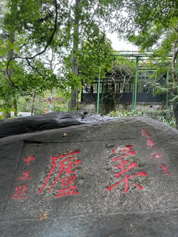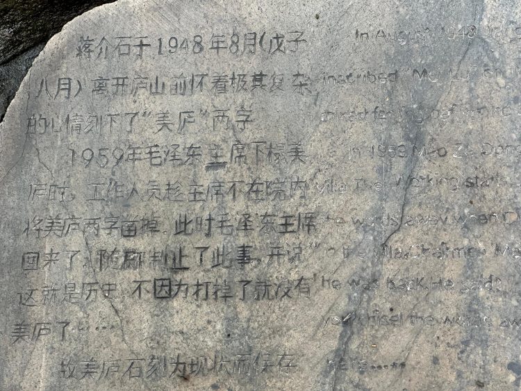 庭园中有一天然裸露石丘,上面铁镌刻着”美庐”二字,左下刻有”中正题”,这是蒋介石于1948年8月亲笔题写。