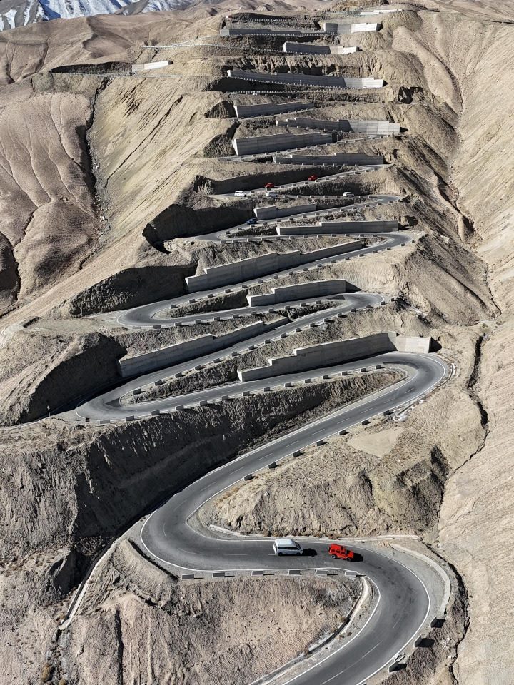 庆幸的是,在塔县每年10月中旬因下雪关系必须关闭的盘龙古道,却让我们赶上了,我们分乘四轮驱动车开心地挑战了那不可思议的600弯道;何止,整个盘龙古道大环线全程140公里,多变的山体与雪山湖构成了独特的地貌特征!