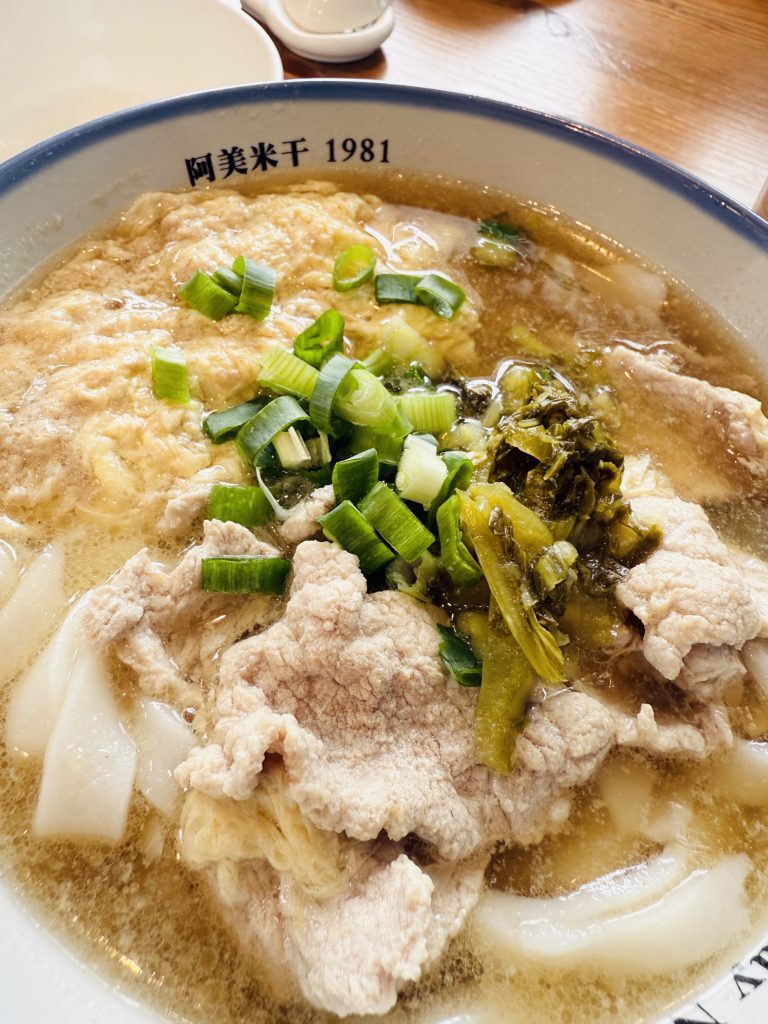 我尝了最不能错过的就是那碗充满故事的 阿美米干。这道源自泰缅边境的料理,由早期随国军迁台的滇缅移民带来。米干看起来像河粉,却更为细腻滑顺,搭配酸菜、豆芽、猪肉片,再淋上特制的高汤,清香中带着微酸,入口温润却层次丰富。