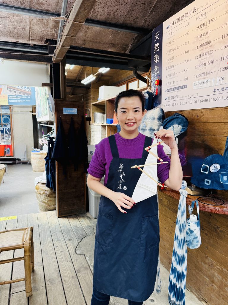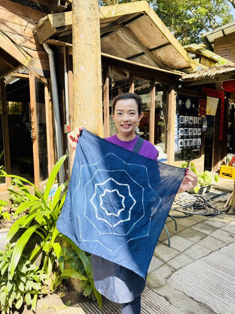 我亲手体验了手作蓝染,经过折叠、捆绑与浸染,呈现出独特的纹理图案。手中拿着的就是我的成品啦!