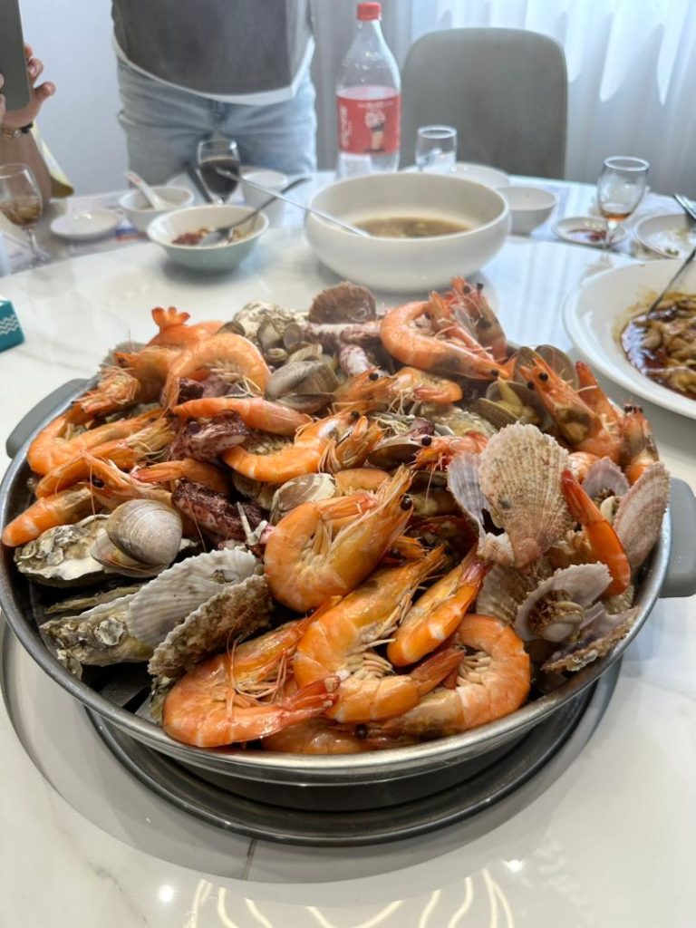 在青岛,海鲜自然是餐桌上的主角。其中颇具特色的一种吃法是 青岛大锅蒸汽海鲜宴。餐桌中央摆放着一口蒸锅,螃蟹、虾、扇贝和各类贝类整齐铺满蒸架,随着蒸汽慢慢升腾,海鲜的香气也随之散开。简单的蒸煮方式几乎不需要太多调味,却能最大程度保留海鲜本身的鲜甜与弹嫩口感,每一口都带着海洋最直接、最纯粹的味道。