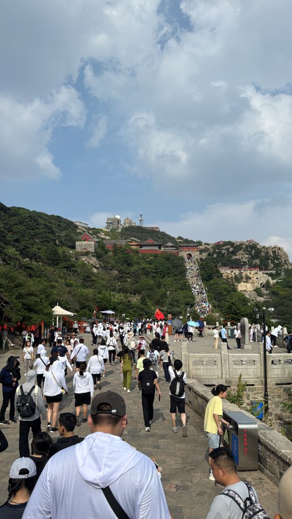 最经典的登山路线从红门开始,一路沿石阶向上。全程超过6000级台阶,对体力确实是个挑战。沿途能看到许多古老石刻、庙宇和松树景观,山间空气也比山下清新许多。 下午时段登山,阳光逐渐变得柔和,光影在石阶和松树间交错。随着高度升高,视野也越来越开阔,远处的群山层叠,山谷中偶尔飘过薄雾,让景色更有层次感。到达山顶时,整个山脉尽收眼底,气温比山下明显凉爽,傍晚的光线也让泰山显得宁静而庄重。