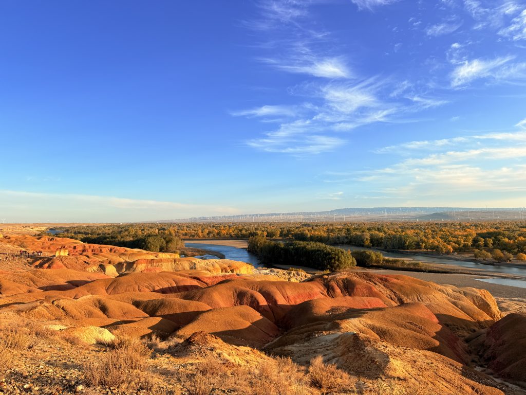 夕阳低斜,光线洒在层层叠叠的岩层上,红、橙、黄、褐交织成丰富的色彩,随着光影不断变化。站在高处远望,大地像被细心调色过,每一层都带着时间沉淀的痕迹。