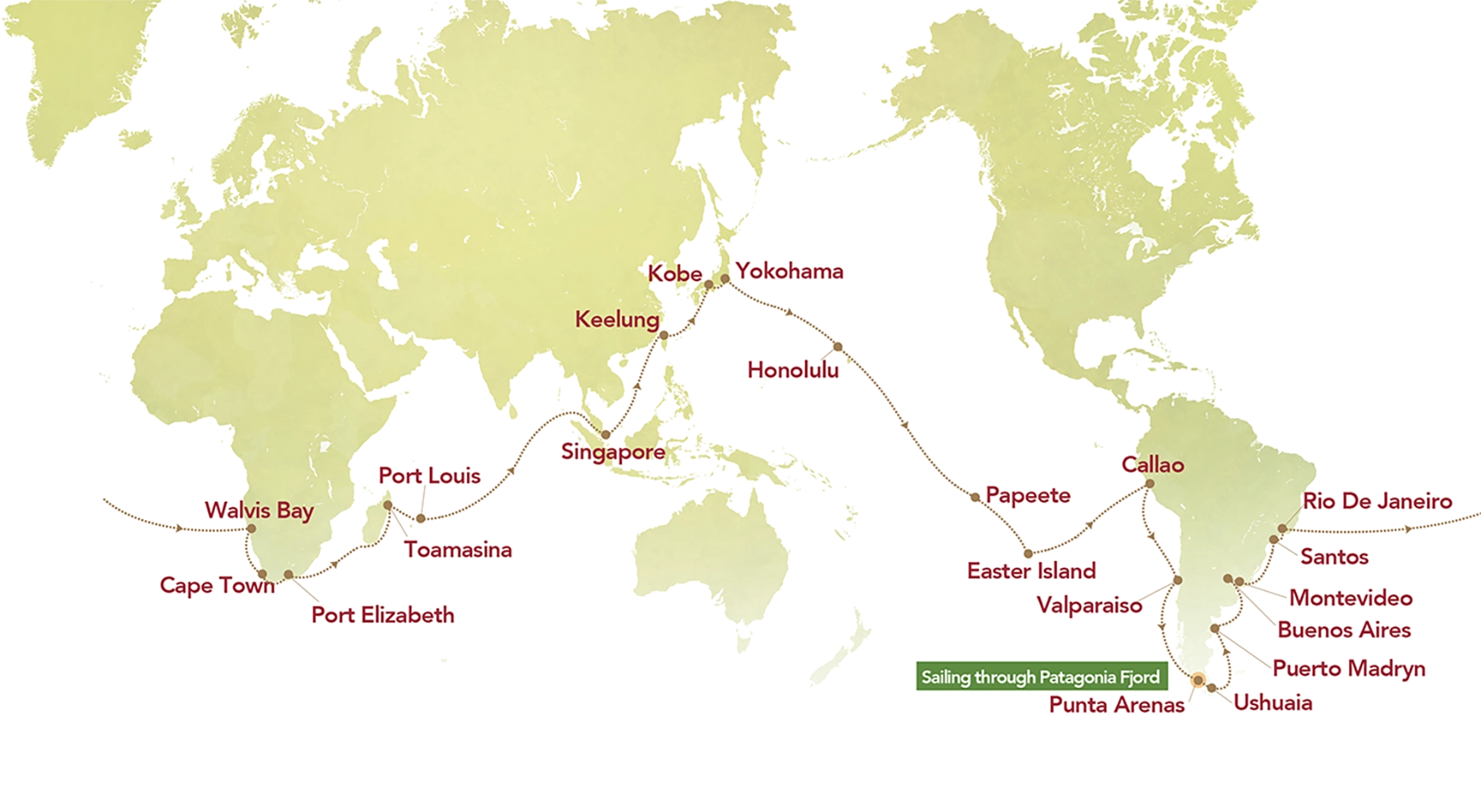 The voyage begins with all the scenic islands in the South Pacific, such as the Polynesian paradise Tahiti, the intriguing Easter Island, and the breathtaking islands of Hawaii.