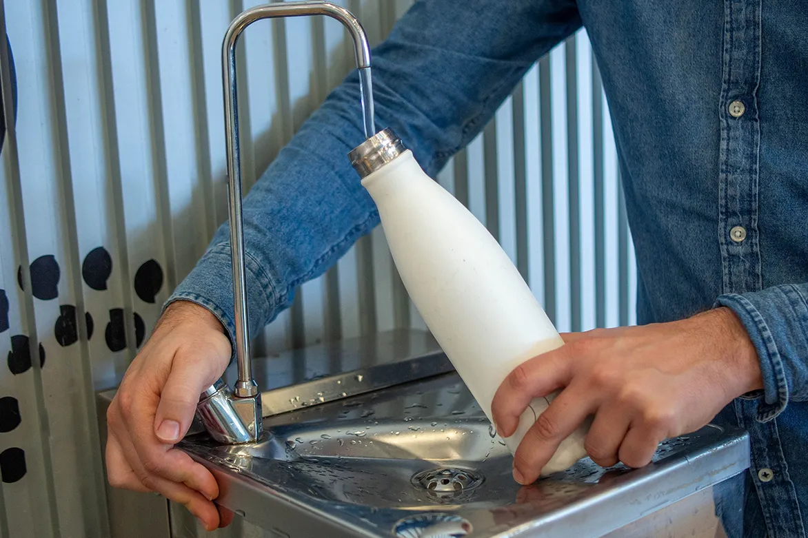 Sunscreen with SPF, reusable water bottle, and cooling scarves or fans.