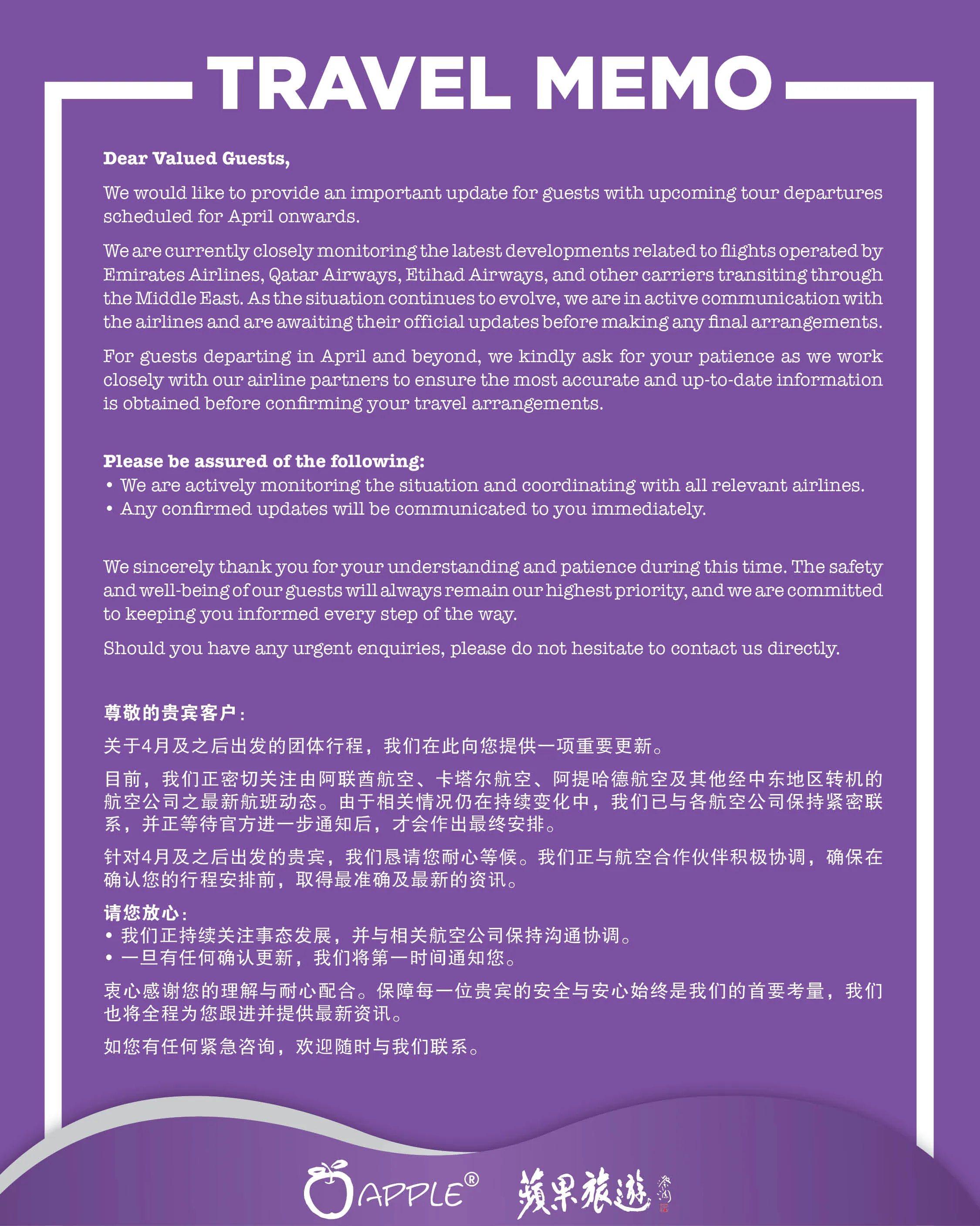 Apple Vacations would like to inform travellers that temporary airspace restrictions in parts of the Middle East may affect selected flights to and from Dubai, Doha, and nearby cities.